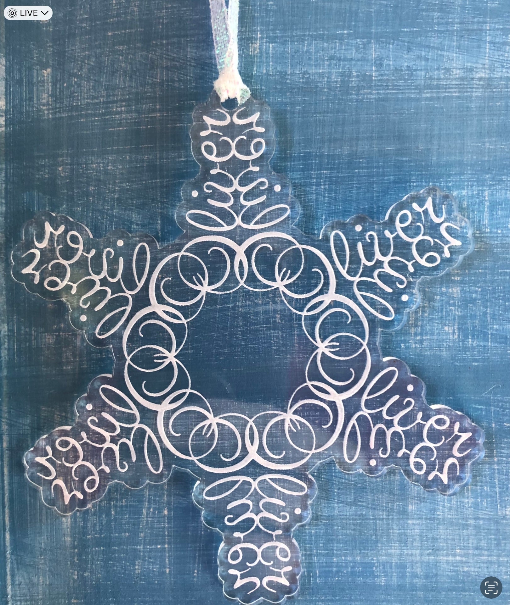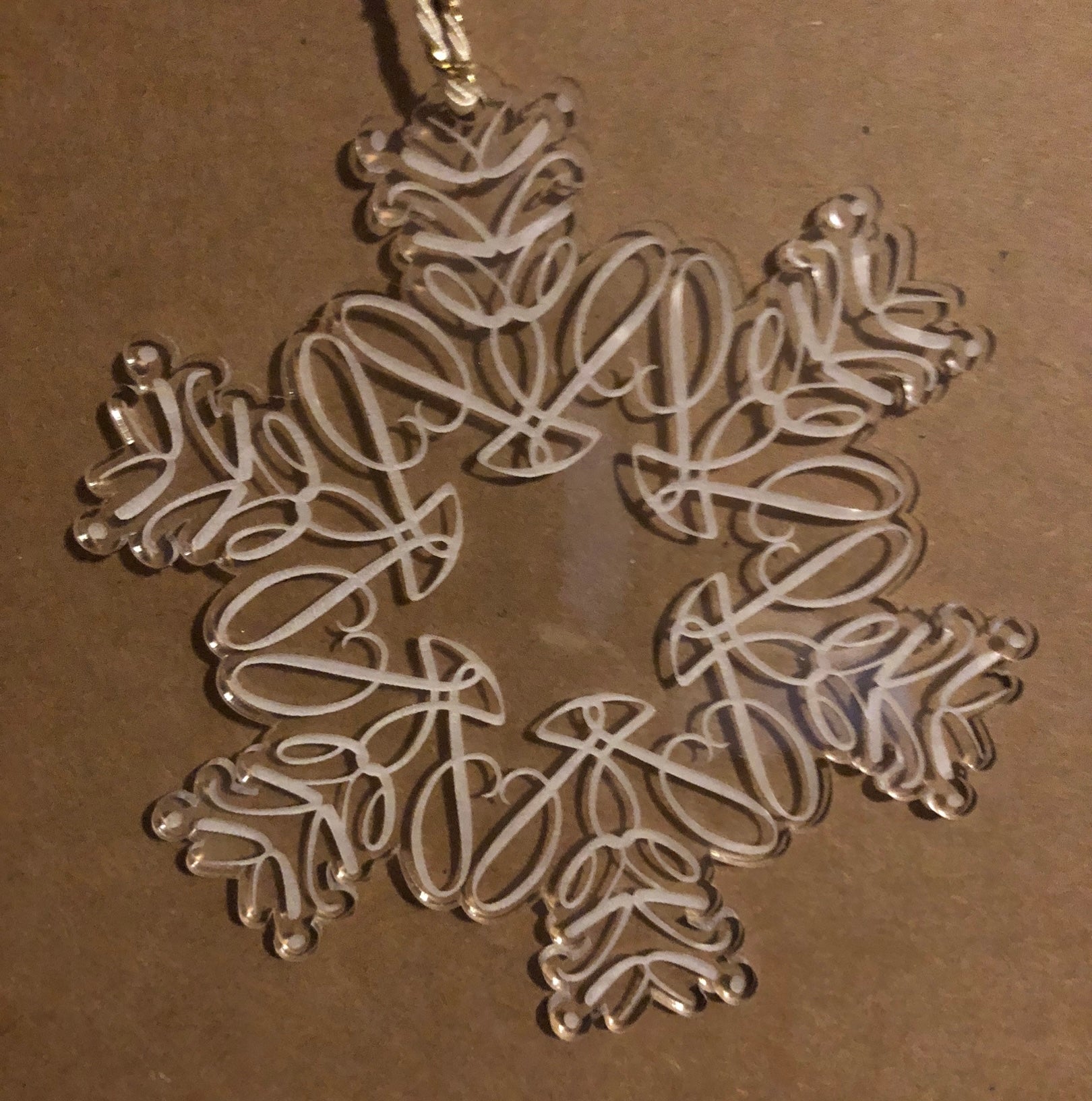 Add sparkle and individuality to your holiday décor with this elegant snowflake ornament crafted from your name. Made from clear acrylic, the design transforms each name into part of a delicate snowflake pattern—just like no two snowflakes are the same, no two ornaments will be either.